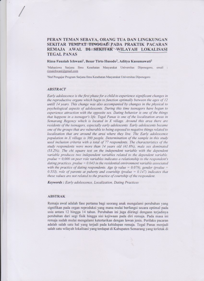 Early adolescence is the first phase for a child to experience significant changes in the reproductive organs which begin to function optimally between the ages of 12 untill 14 years. This change was also accompanied by changes in the physical to psychological aspects of adolescents. During this time teenagers have begun to experience attraction with the opposite sex. Dating behavior is one of the things that happens in a teenager's life. Tegal Panas is one of the localization areas in Semarang Regency which is located in X village. Around this area there are residents of the teenagers, especially early adolescents. Early adolescents became one of the groups that are vulnerable to being exposed to negative things related to localization that are around the area where they live. The Early adolescence population in X village is 380 people. Determination of the sample in this study used inclusion criteria with a total of 77 respondents. The characteristics of the study respondents were more than 14 years old (41.6%), male sex dominated (53.2%). The chi square test on the independent variable with the dependent variable produces two independent variables related to the dependent variable. pvalue = 0,000 on peer role variables indicates a relationship to the respondent's dating practices. pvalue = 0.043 in the residential environment variable associated with the practice of dating respondents. Age (p value = 0.079), gender (pvalue = 0.553), role of parents at puberty and courtship (pvalue = 0.147) indicates that these values are not related to the practice of courtship of the respondent.