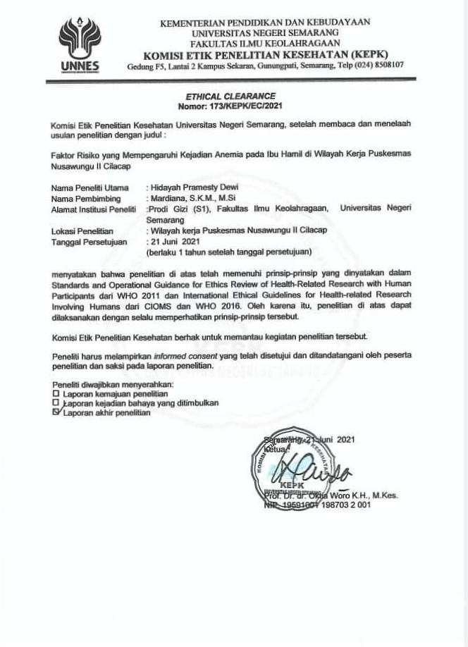 Conclusion: Gestational age, nutritional status of pregnant women, diversity of food consumption, compliance with Fe tablet consumption, education level, economic status and dietary restrictions are risk factors for anemia in pregnant women in the working area of Nusawungu II Public Health Center Cilacap.