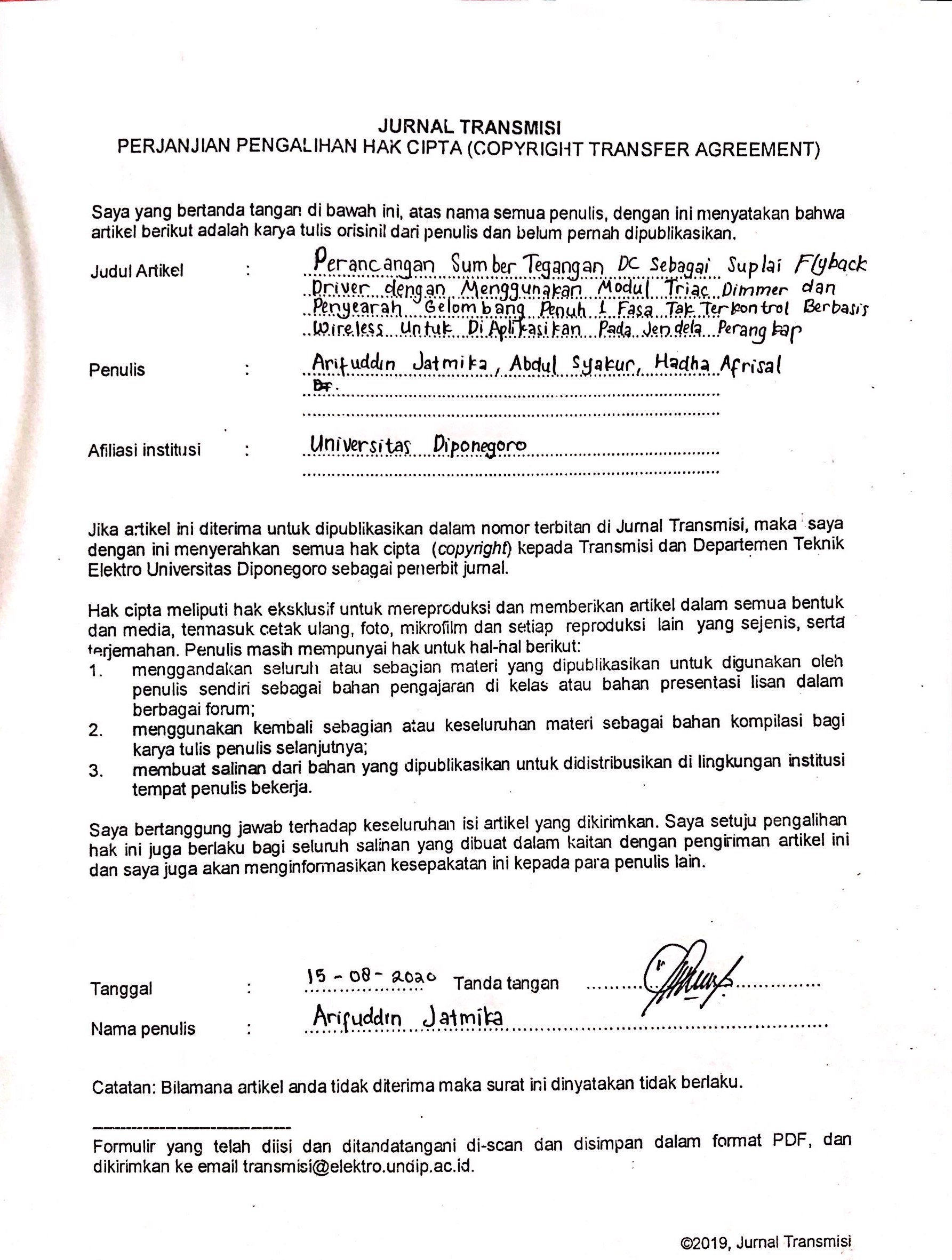Open Access Copyright 2020 Transient: Jurnal Ilmiah Teknik Elektro under http://creativecommons.org/licenses/by-nc/4.0.